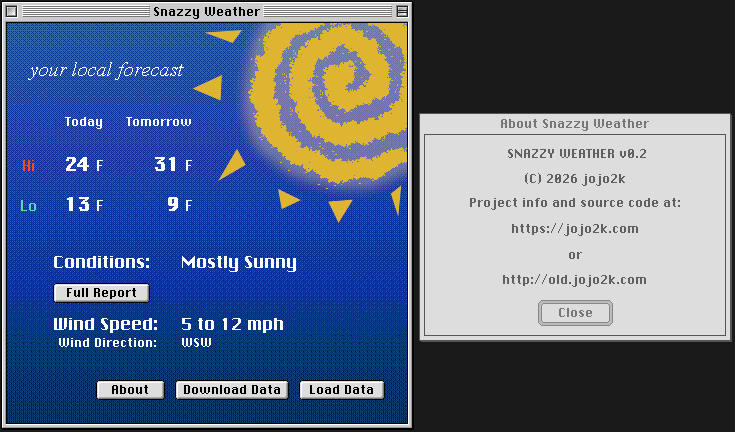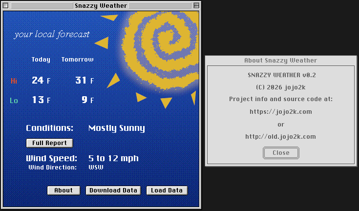 USAGE: download the program, run it on your favorite Mac or Mac emulator running something around System 7 through Mac OS 9, press Download Data to fetch weather data, then click Load Data. Or, if you've already downloaded the data for the day, just click Load Data. (If you try it, let me know how it works and what OS/machine you're using!)
